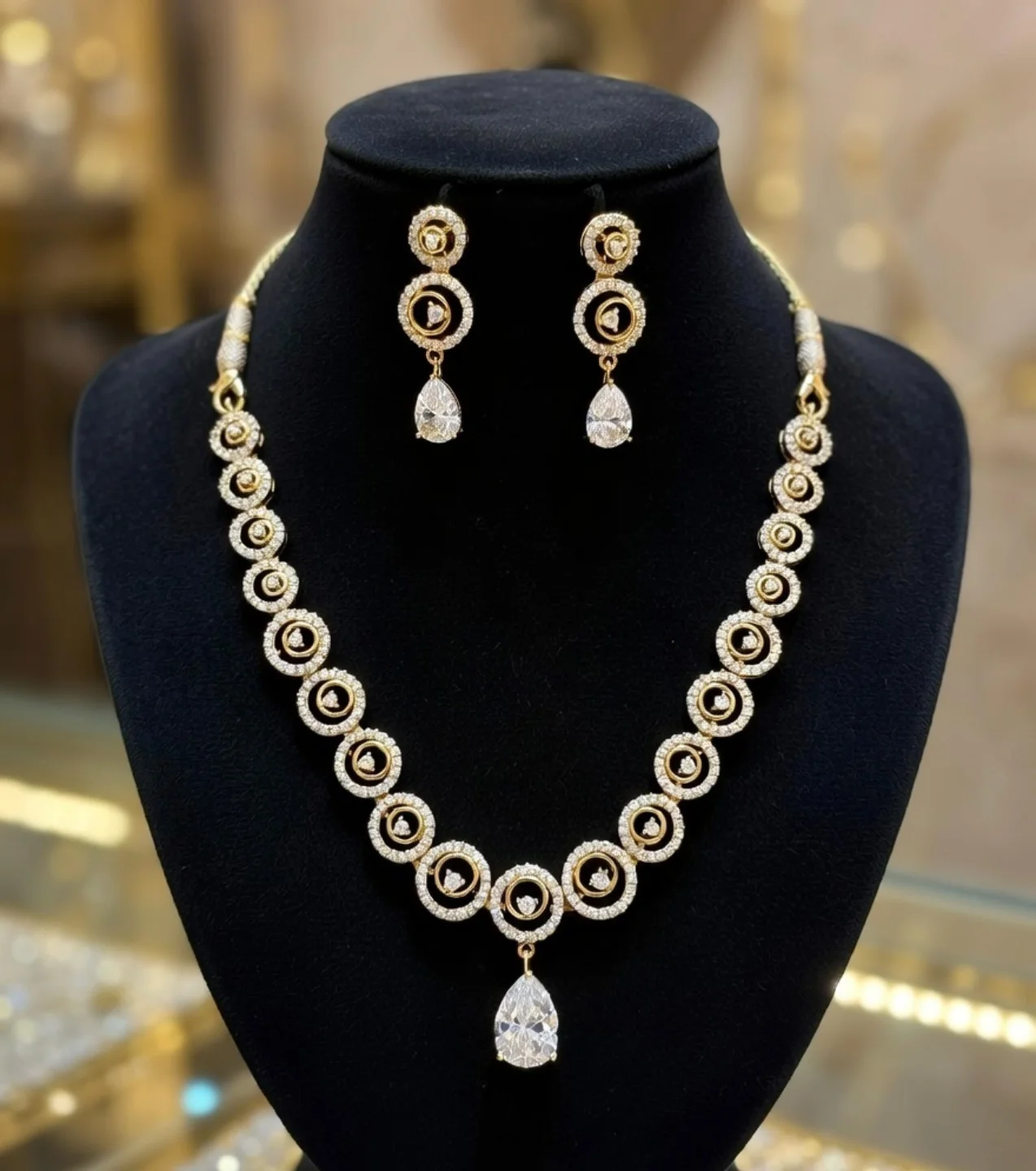 Gold‑tone circular chain studded with sparkling CZ stones + a dazzling teardrop pendant. Paired with matching double‑stud earrings with a pear‑shaped drop. Perfect for everyday glam 💎