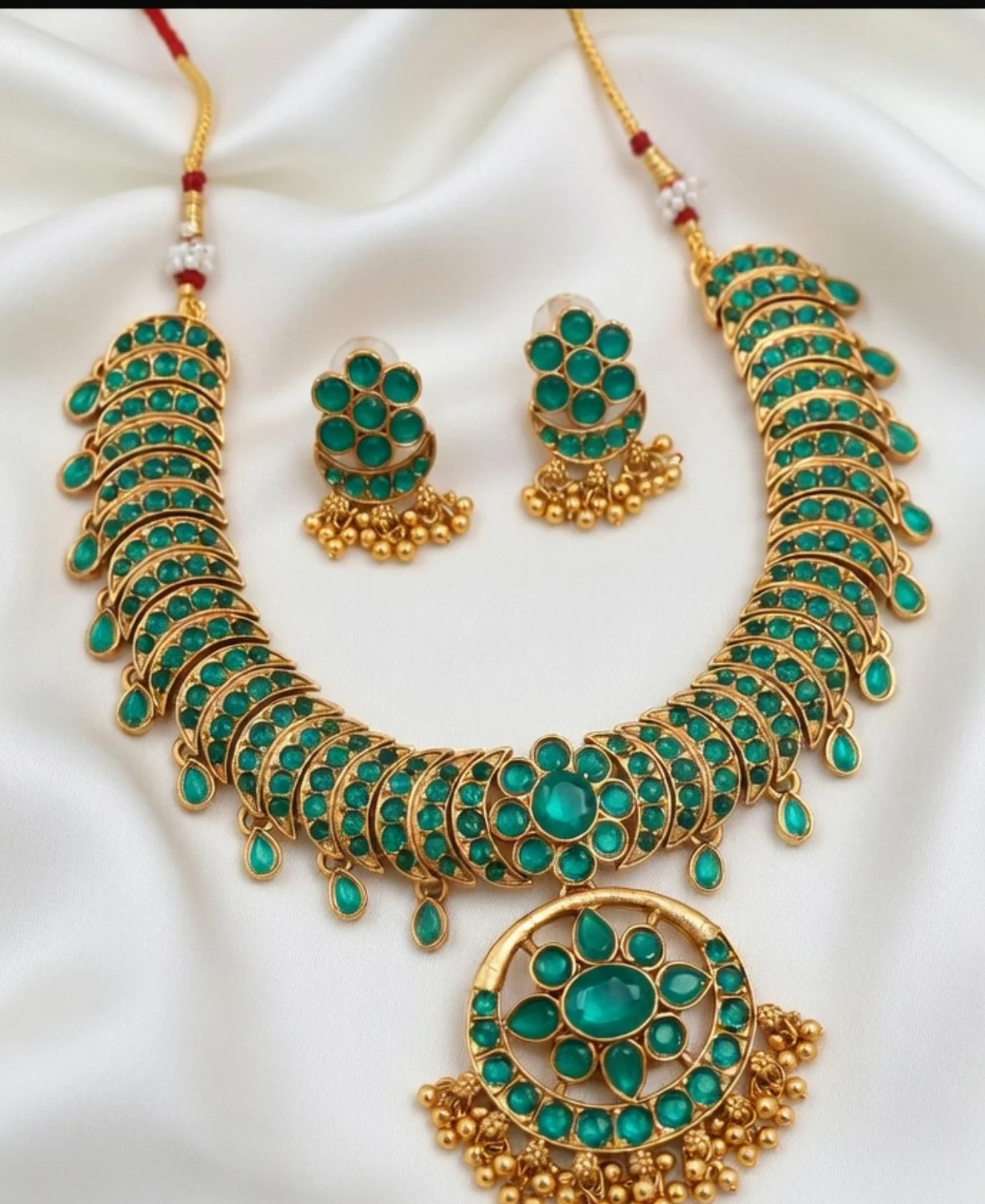 Stunning gold‑finish necklace with layered emerald‑green gemstones & a bold pendant, paired with matching flower‑design earrings. Traditional craftsmanship meets modern glam – perfect for festive looks & special occasions. 👑💚 Add this regal set to your collection & shine at every celebration!