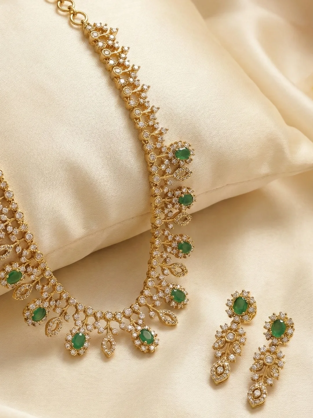 Paired with matching leafy-pattern earrings embedded with emerald and AD stones for a complete, graceful finish