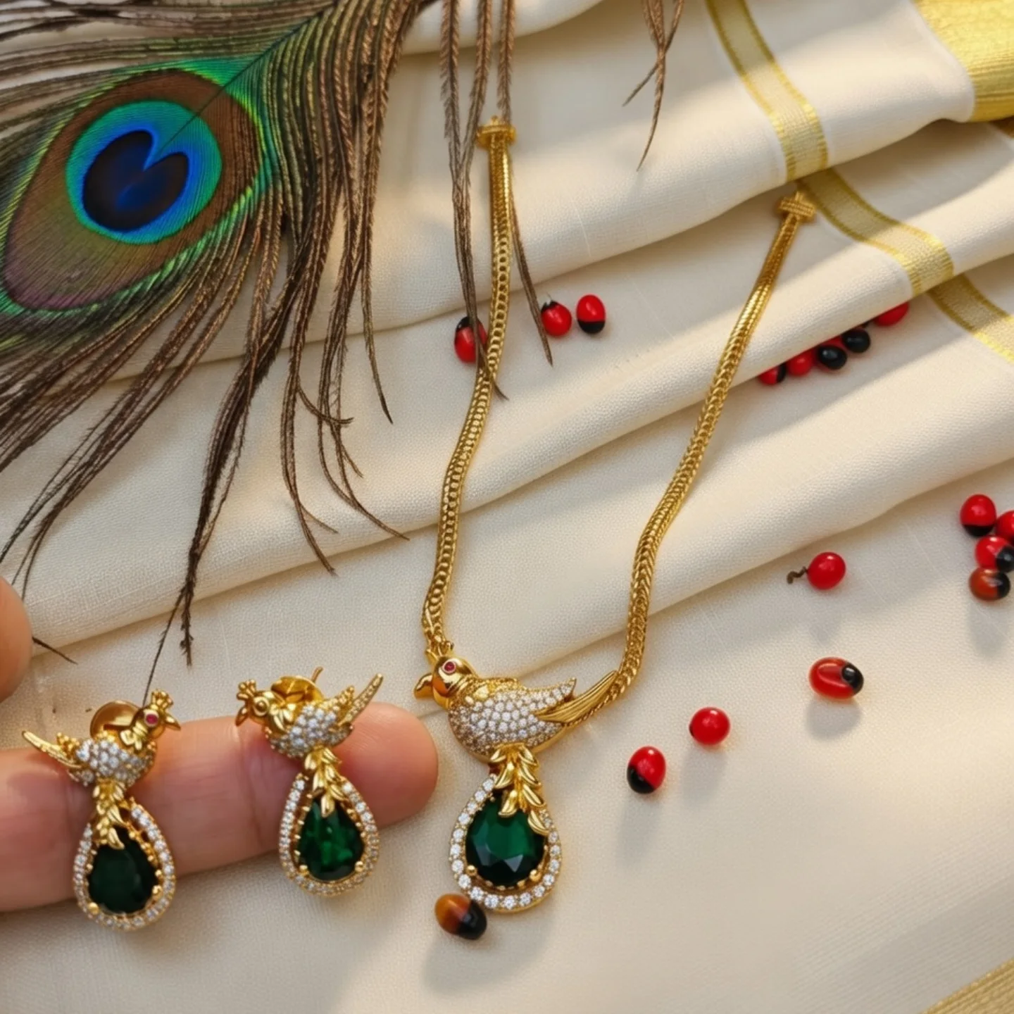 A luxe semi‑formal jewellery combo crafted in rich gold‑plated metal. The necklace features a sparkling bird pendant studded with white zirconia, a bold emerald‑green teardrop gemstone, and tiny pearl accents. Matching jhumka earrings have the same bird design topped with zirconia and a green teardrop drop for an elegant finish. Perfect for ethnic & modern styling!