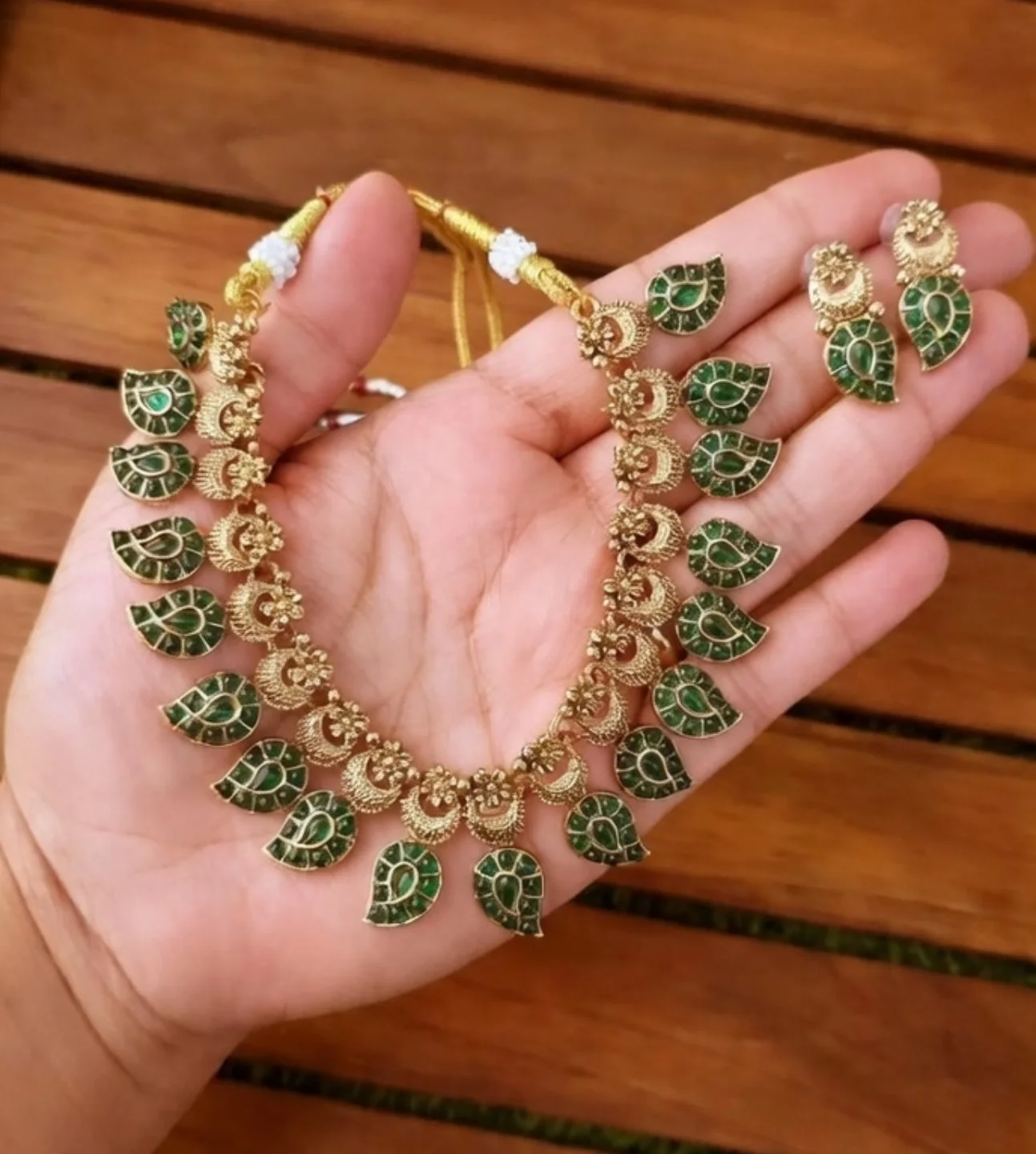 A gorgeous traditional mango‑shaped Kemp necklace paired with matching earrings, crafted with gold‑plated metal and emerald‑green Kemp stones. The design features intricate leaf‑like motifs and an adjustable thread closure for a comfortable fit, adding an elegant ethnic vibe to any look. Perfect for festivals, weddings, or special occasions.