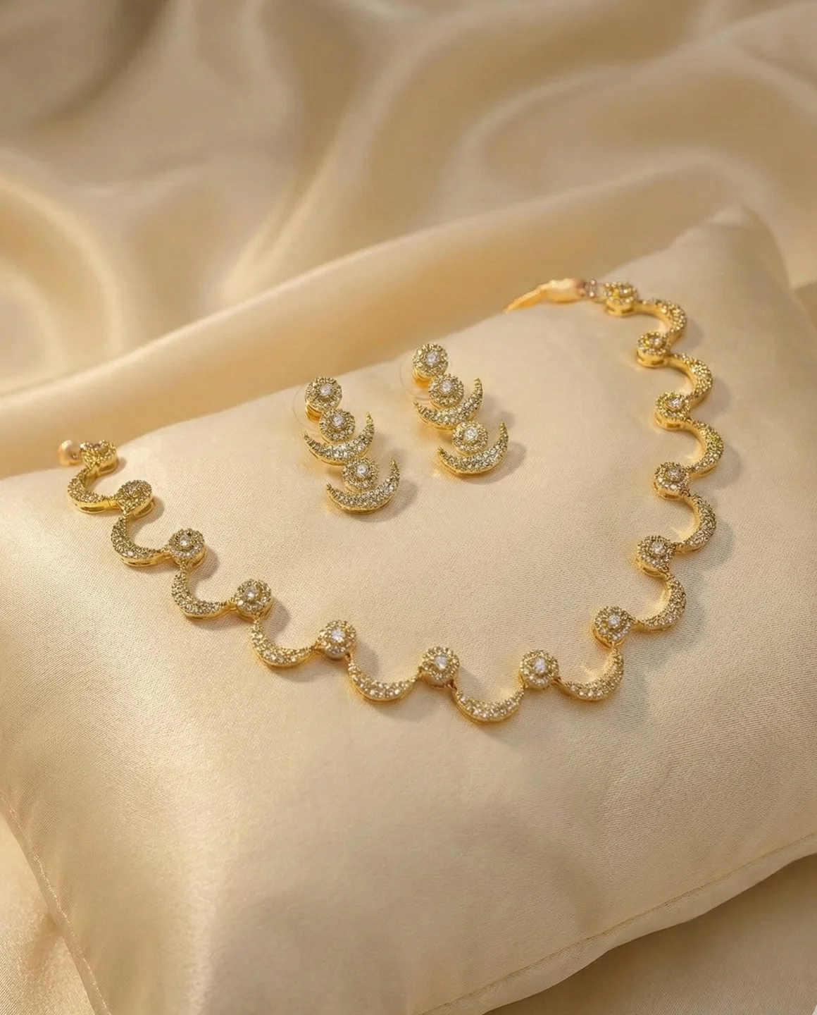 This gold-tone necklace with matching earrings showcases a beautiful repeating crescent moon pattern, elegantly embellished with sparkling American Diamonds (AD) ✨