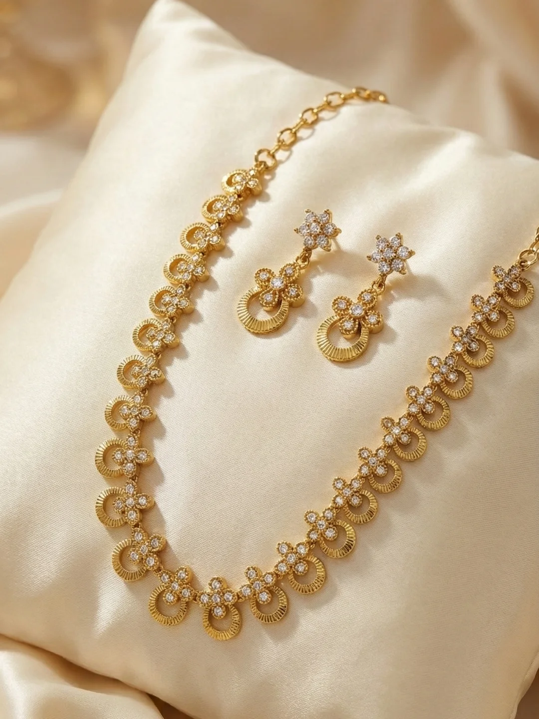 This gold-toned necklace features small floral motifs embedded with AD stones, beautifully paired with cute matching earrings with the same detailing ✨