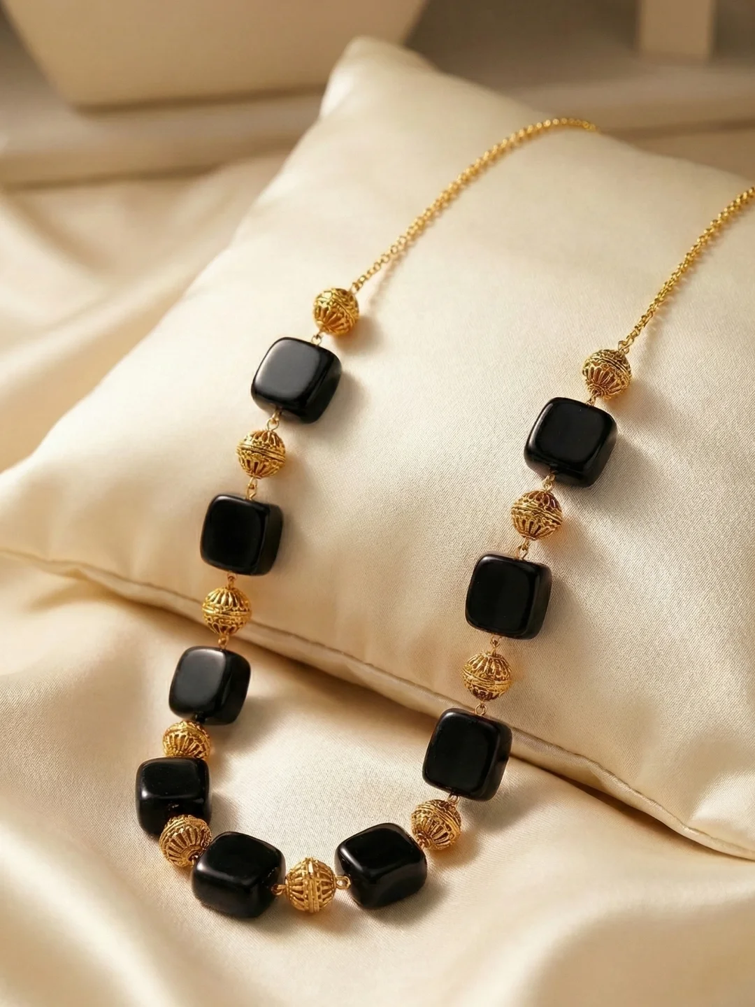 Crafted with a sleek gold-toned chain, this necklace features square-cut black gemstone beads beautifully spaced with intricate gold filigree beads, creating a chic modern-boho vibe ✨
