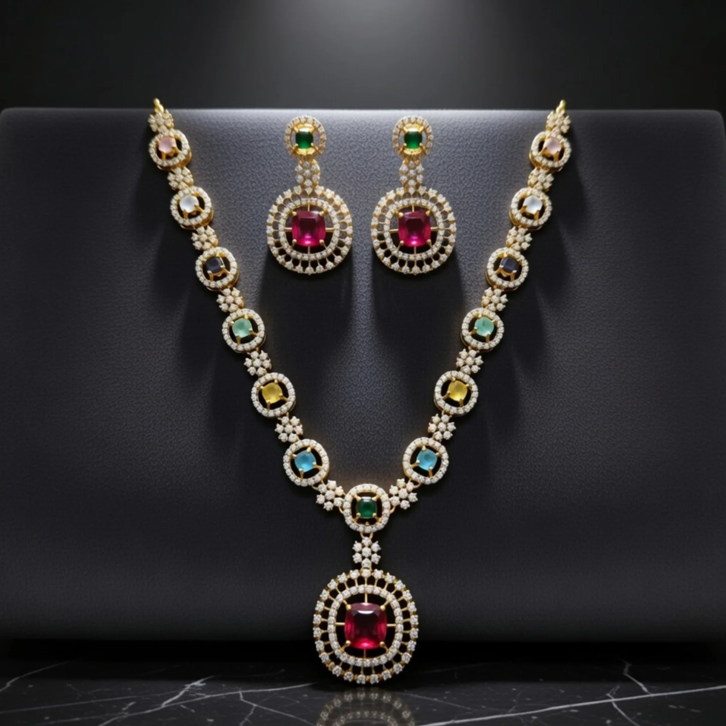 ✨ Stunning gold-toned necklace set studded with vibrant pink, green, blue, yellow & white gemstones, encircled by sparkling diamond-like accents. ✨ The intricately designed necklace features a regal pendant with a large pink gemstone, paired with matching earrings topped with green stones and pink centerpieces. Perfect for weddings, festivals, or everyday glamour.
