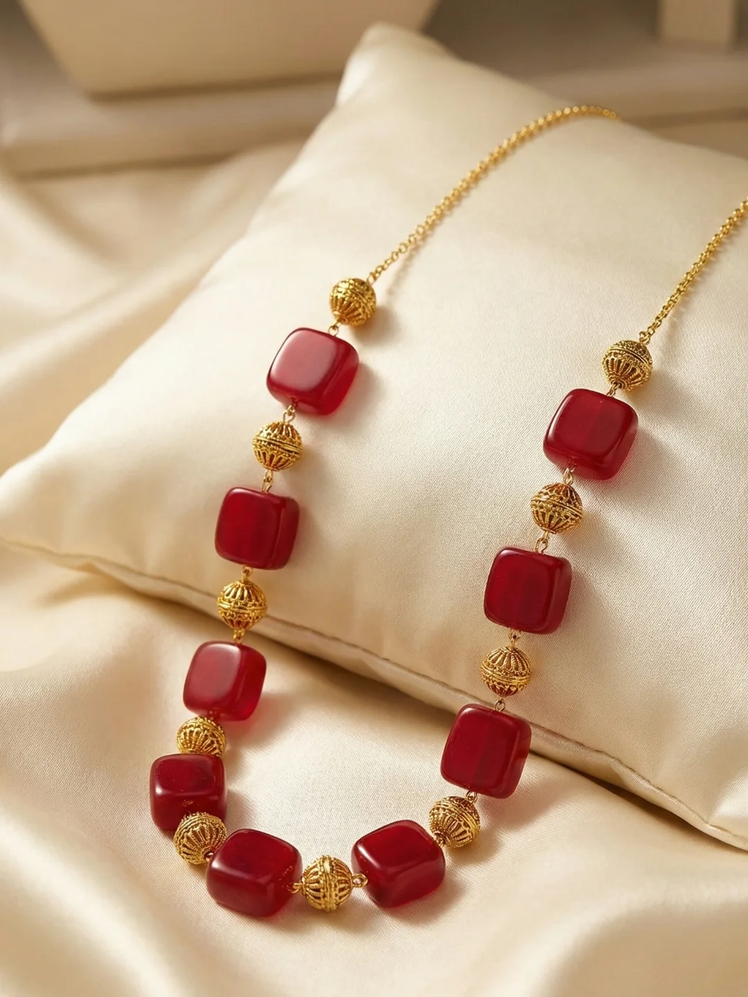 Crafted with a sleek gold-toned chain, this necklace features square-cut red gemstone beads beautifully spaced with intricate gold filigree beads, creating a bold modern-boho look ✨