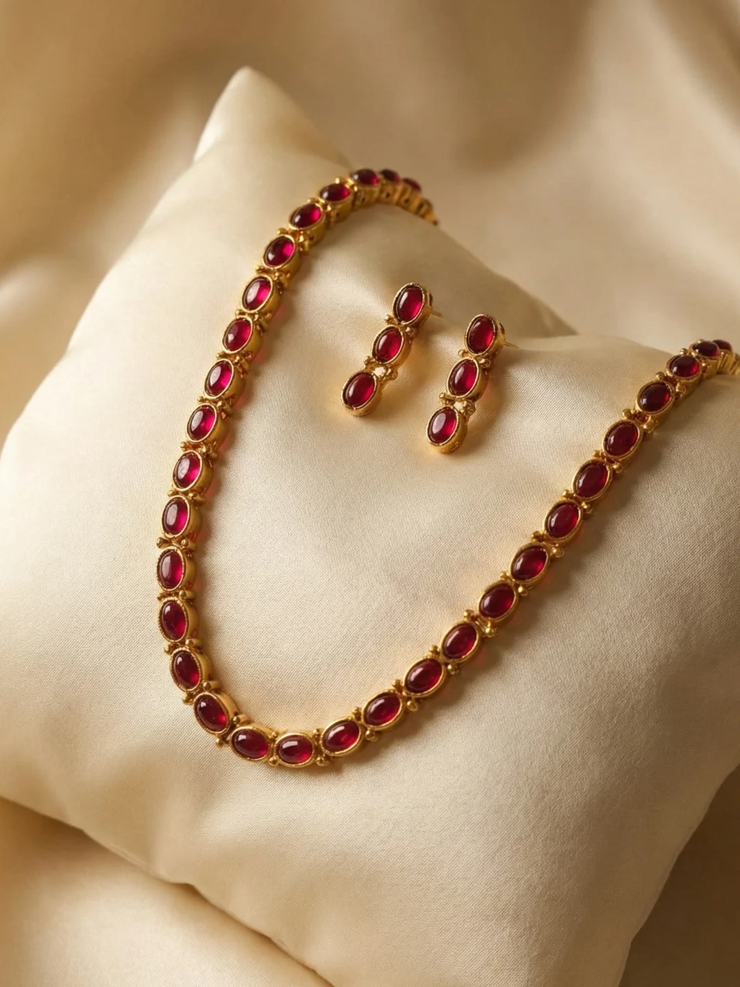 An elegant gold-toned necklace designed with a graceful curve of alternating oval red gemstones, perfectly paired with matching three-stone drop earrings ✨