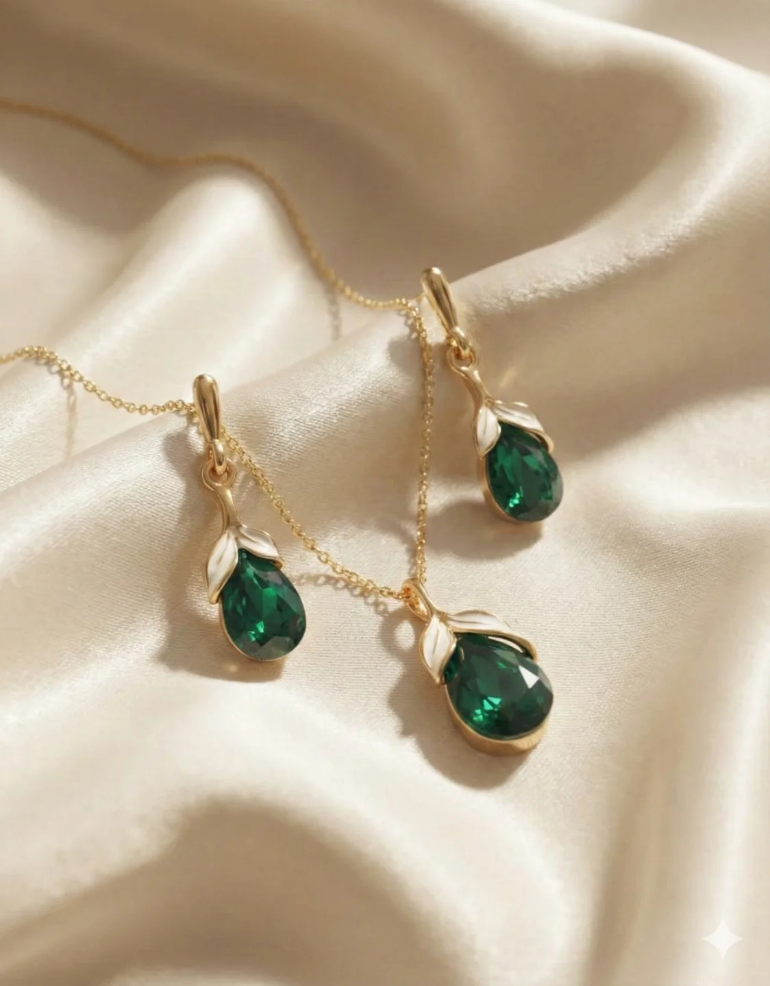 🔸 Teardrop-shaped emerald green crystal 💎 framed with delicate leaf details