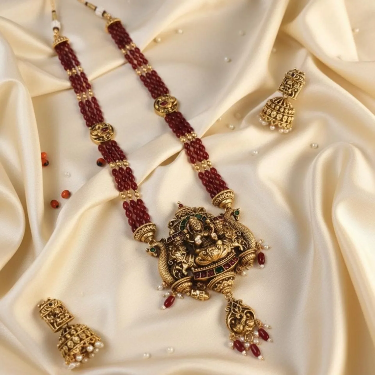 A regal, handcrafted long necklace paired with matching jhumkas that scream traditional elegance. The necklace features maroon bead strings with a gold Lakshmi pendant adorned with green & red stones, pearls, and intricate temple detailing, perfect for festive or wedding looks.